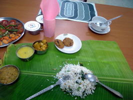 お昼を食べに宿舎へ行くとバナナの葉っぱにご飯を乗せ